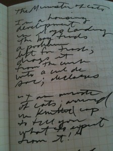 I thought, the minister of cats –– and jotted that down in my Field Notes notebook, which Robbie rather hassled me for having; so I figure he rather owes me the cat-minister image. I scribbled out the image into a quick poem upon stopping at the Starbucks on my way home.