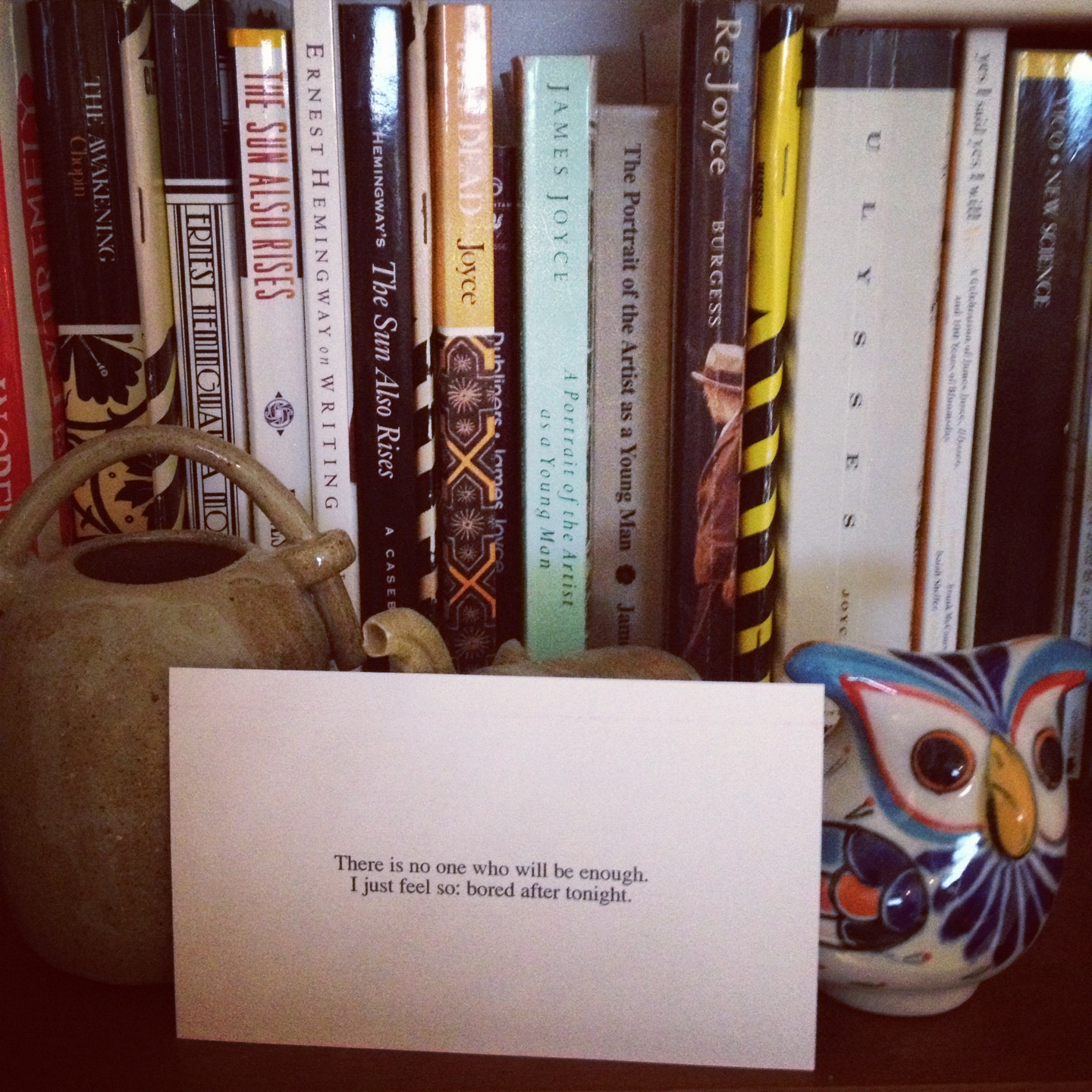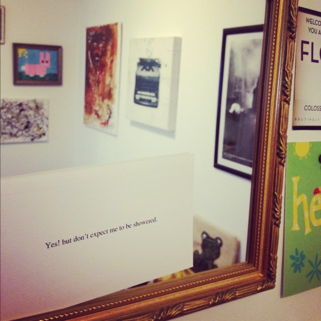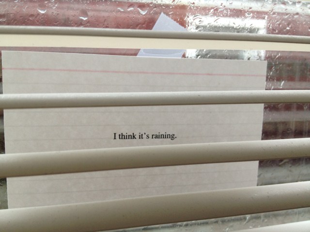 This morning, as it looked to rain––after a quick walk with Effie, and on a whim––I decided to print out on index cards some text messages I had sent to friends this week & set them up around the apartment to Instagram.